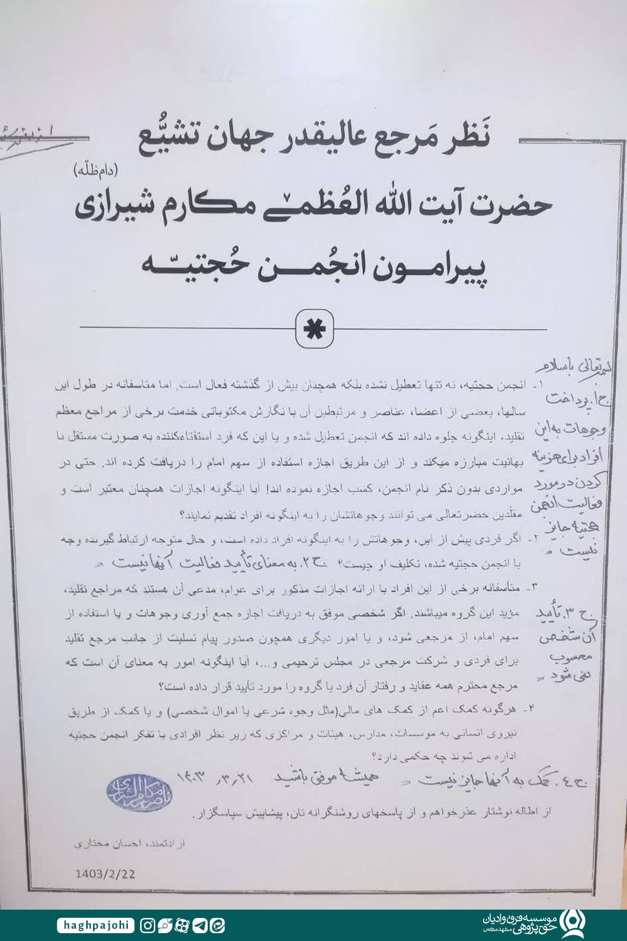 در حاشیه این مراسم، از دو استفتاء جدید صادرشده از سوی آیتالله نوری همدانی و آیتالله مکارم شیرازی رونمایی شد. برگزارکنندگان اعلام کردند این استفتائات در پاسخ به اجازات پیشینی است که انجمن حجتیه با شیطنت از مراجع تقلید گرفته. متن این استفتائات مانع از سوءاستفادههای این تشکیلات در زمینه دریافت وجوهات شرعی میشود.