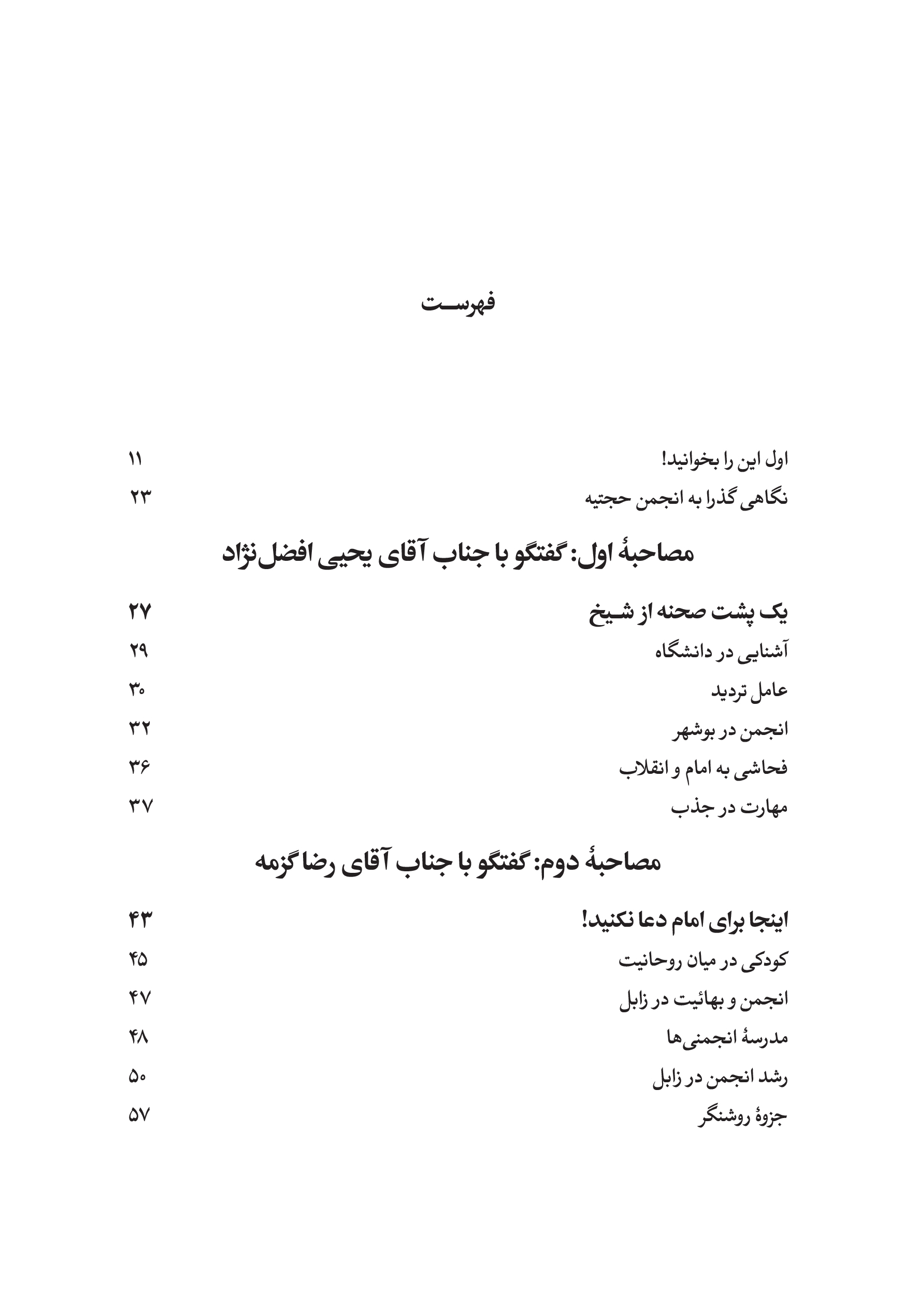 یکی از راههای شناخت گروهها، احزاب، سازمانها و فرقهها، گفتگو با اعضای جداشدۀ از آنهاست. ممکن است فردی فقط چند سال عضو تشکیلاتی بوده باشد، اما اطلاعات و تجربیاتش از کسی که سالها از بیرون به آن تشکیلات نگریسته و دربارۀ آن تحقیق کرده، بیشتر باشد. این موضوع درخصوص تشکیلات «انجمن حجتیه» نیز صدق میکند. اثر پیش رو نخستین کتابی است که به مصاحبههایی برای آشنایی بیشتر با این تشکیلات و تفکر آنان پرداخته است.