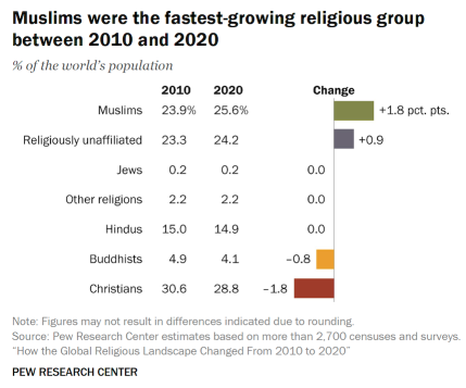 در مقابل، جمعیت مسلمانان جهان با رشد انفجاری ۳۴۶.۸ میلیون نفری، بیشتر از مجموع رشد همه ادیان دیگر، به حدود ۲ میلیارد نفر رسید. سهم مسلمانان از جمعیت جهان ۱.۸ واحد درصد افزایش یافت و به ۲۵.۶٪ رسید. این رشد سریع، عمدتاً حاصل ساختار جمعیتی جوان و نرخ باروری بالاتر در کشورهای با اکثریت مسلمان است. براساس این روند، پیشبینی میشود اختلاف جمعیتی بین دو دین بزرگ جهان در دهههای آینده به سرعت کاهش یابد.